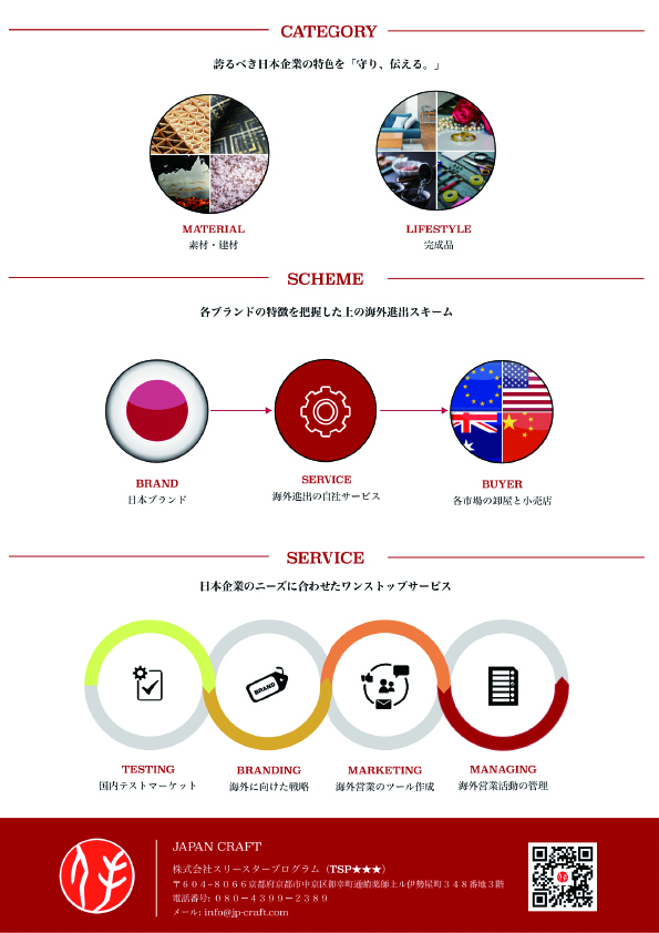 | サービス | ○「Japan craft」ECサイトへ掲載 ○ インバウンド専用 販売サイトへ掲載 ○ テストマーケットからの戦略企画 ○ 海外に向けたブランディング戦略·商品開発 ○ 販売に向けたマーケティング戦略·プロモーション企画 ○ 海外へマネージング企画·販売代行 |